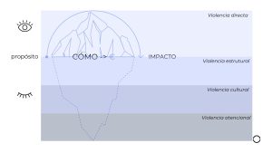 En la base del iceberg, el autor Otto Scharmer añade una capa más al modelo de Galtung, hablando de violencia atencional: esa parte del liderazgo donde elegimos no mirar lo que ya sabemos que nos incomoda.